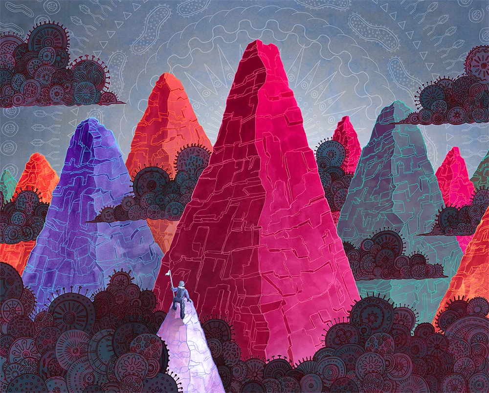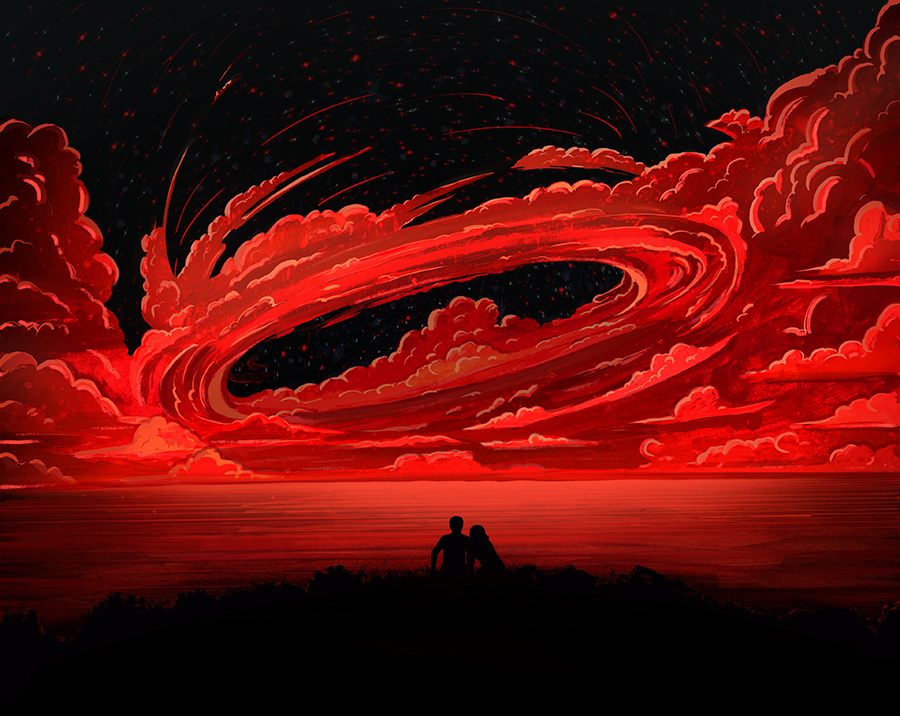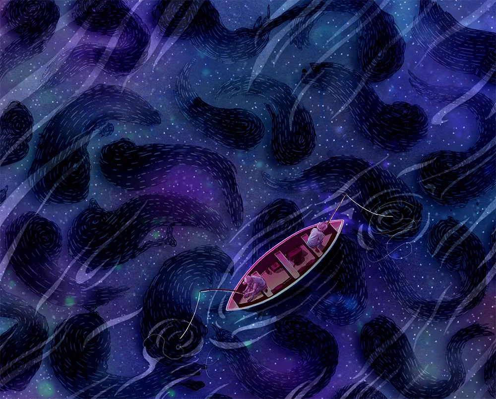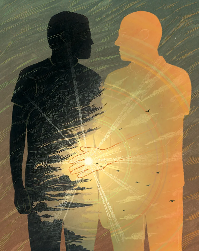 Inspired by "Up and Vanished" and Payne Lindsey's investigation into the missing persons case of Kristal Reisinger, this illustration shows Kristal reaching out and guiding Payne to the answers behind her disappearance in the woods of Crestone, Colorado.